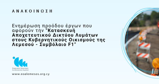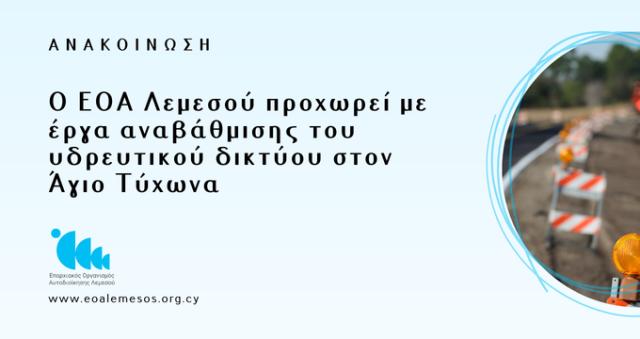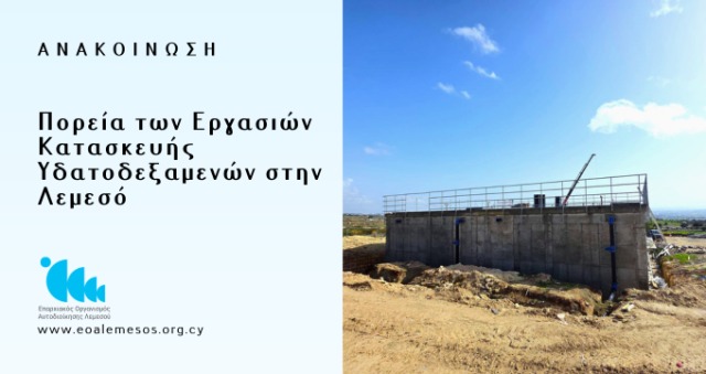 Ο ΕΟΑ Λεμεσού ενημερώνει ότι οι εργασίες κατασκευής των Υδατοδεξαμενών στις περιοχές Αγίου Αθανασίου, Κάτω Πολεμιδιών, Γερμασόγειας και Αγία Φύλας, προχωρούν κανονικά. Περιοχή: Συκαμίνου (Άγιος Αθανάσιος) -