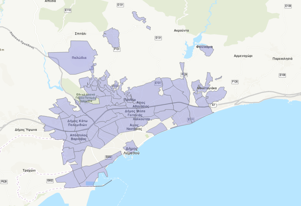 • Δήμος Λεμεσού: Κάψαλο, Απ. Πέτρου & Παύλου, Άγιος Γεώργιος, Απ. Ανδρέας, Τζαμί Τζενίτ, Αγία Νάπα, Ζακάκι, Τσιφλικούδια, Άγιος Σπυρίδωνας, Κοντοβάθκια, Τίμιου Σταυρού, Χαλκούτσα, Αγία Φύλα, Εκάλη, Πάνθεα, Παναγία Ευαγγελίστρια