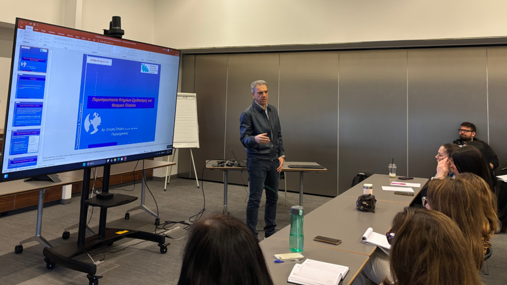 Κατά τη διάρκεια του σεμιναρίου, ο Δρ. Σπύρου ανέλυσε και επεξήγησε το ισχύον κανονιστικό πλαίσιο που διέπει τον σχεδιασμό των κτηρίων σε θέματα πυροπροστασίας, καθώς και τις απαραίτητες προδιαγραφές που πρέπει να τηρούνται κατά την εκπόνηση και αξιολόγηση πολεοδομικών και οικοδομικών αιτήσεων.