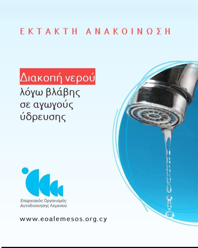 Λόγω βλάβης σε παροχετευτικό αγωγό έγινε διακοπή της υδροδότησης στην περιοχή Ύψωνα.