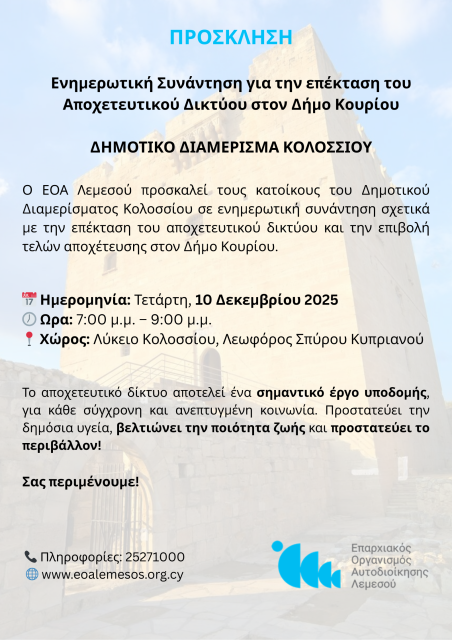 Δημοτικό Διαμέρισμα Κολοσσίου - Ενημερωτική Συνάντηση για την επέκταση του Αποχετευτικού Δικτύου στον Δήμο Κουρίου